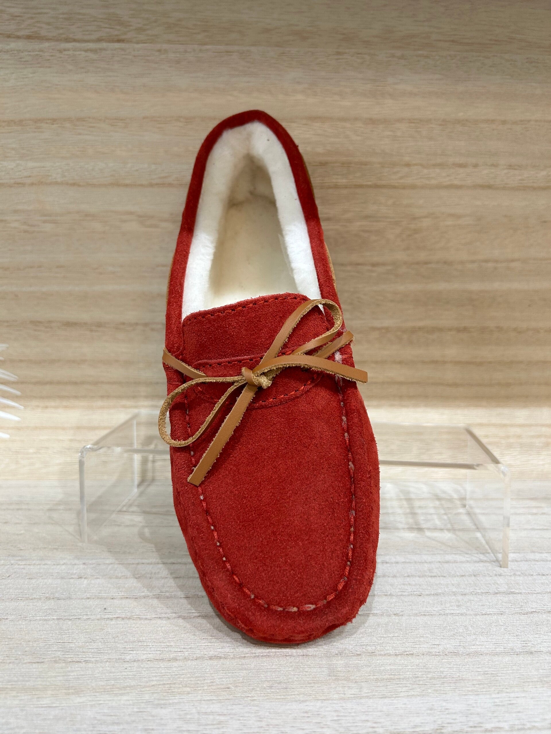 Die kuschelig warmen Mokassins aus rotem Veloursleder sind zu Hause der perfekte Begleiter in der kalten Jahreszeit.