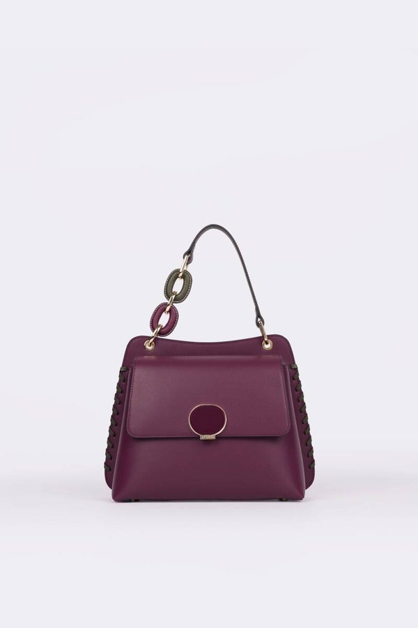 Handtasche aus glattem Kalbsleder, verziert mit Ledernähten, Leder- und Metallringen am Griff, verstellbarem Lederriemen und emailliertem Metallverschluss mit Cromia-Logo. Hellgoldene Accessoires.