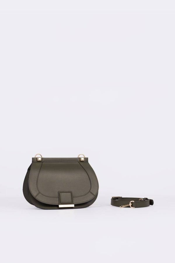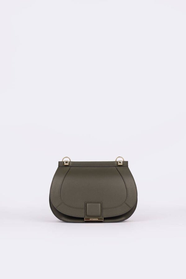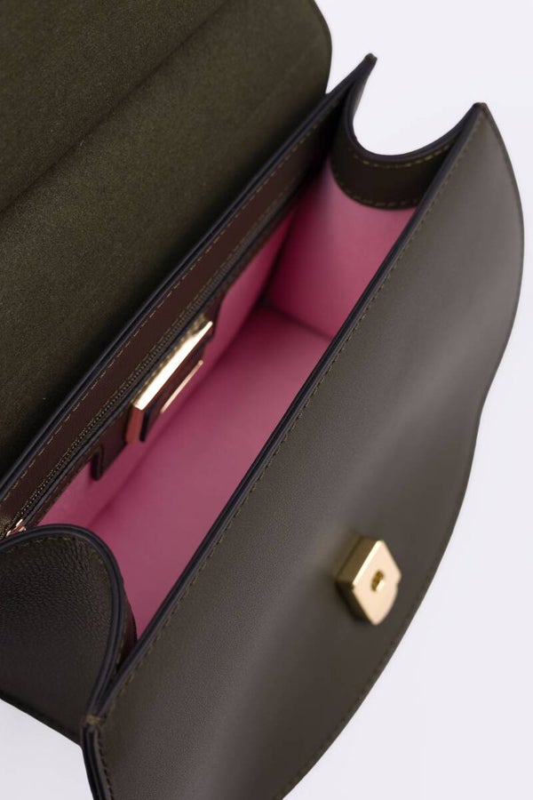 Crossover aus glattem und mikrogranuliertem Kalbsleder, gewölbtem Leder und Metallverschluss, hellgoldenen Accessoires.