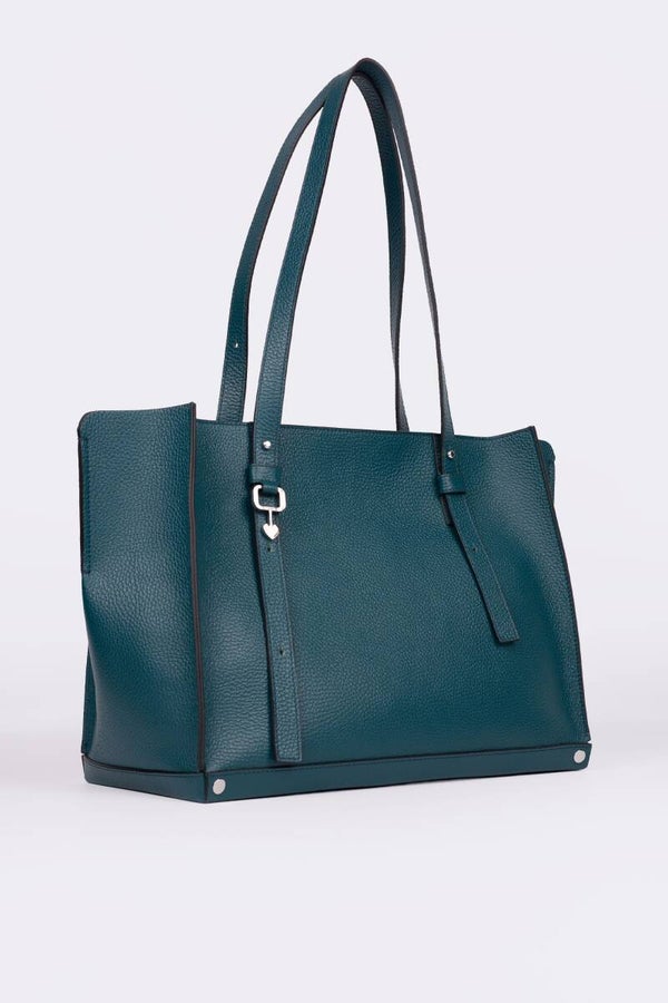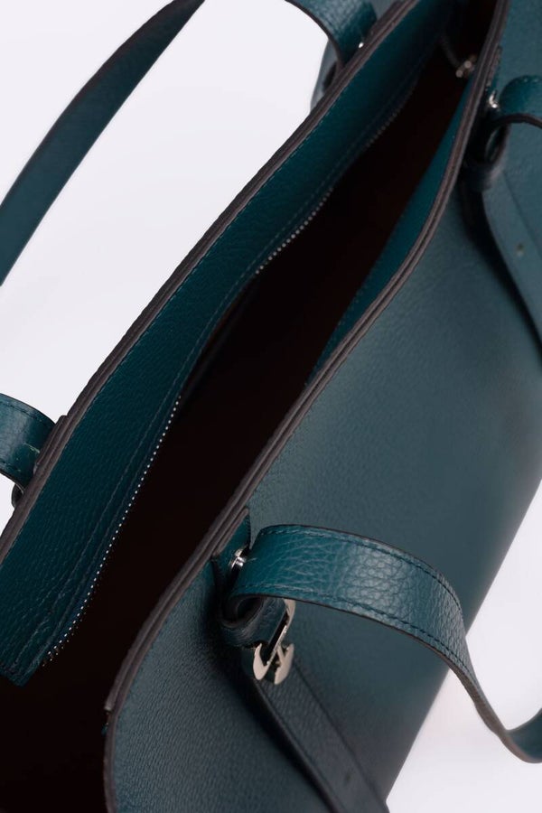 Einkaufstasche aus Kalbsleder mit Hirschprint, Innenseite aus Mikro-Wildleder, verstellbare Griffe, große und funktionelle Tasche. Silberfarbene Accessoires.