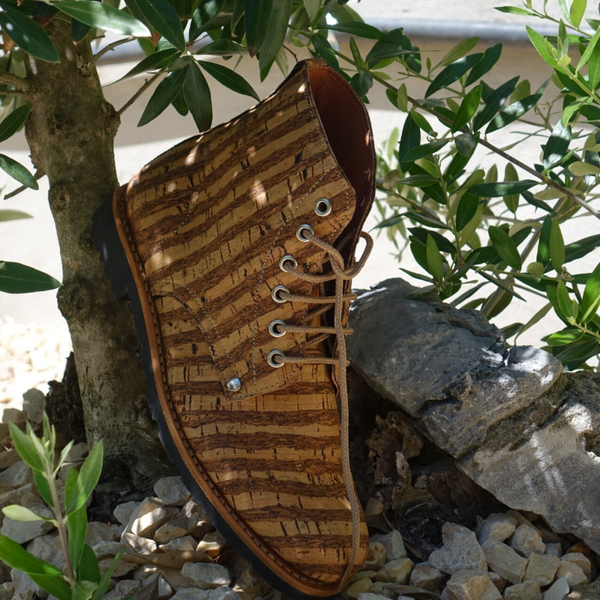 Handgefertigte Schnürstiefel aus Kork mit Cap Toe. Rahmengenäht (Goodyear-Rahmenkonstruktion) und wasserabweisend. Die Stiefel bestechen mit Festigkeit, Formbeständigkeit, Haltbarkeit, Belüftung und sie sind reparabel.